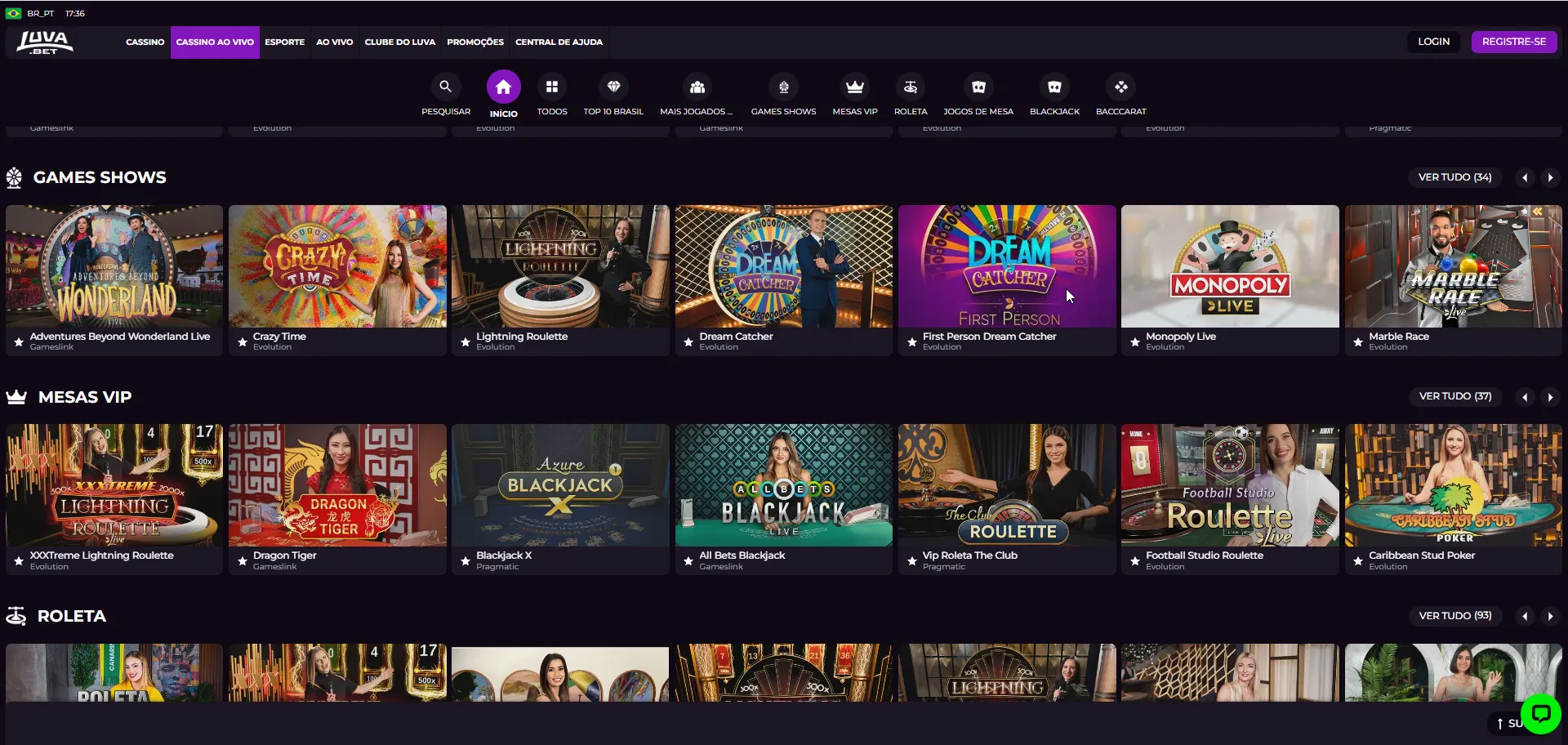 O Live Casino é alimentado principalmente por Pragmatic Play, com mesas transmitidas em tempo real.