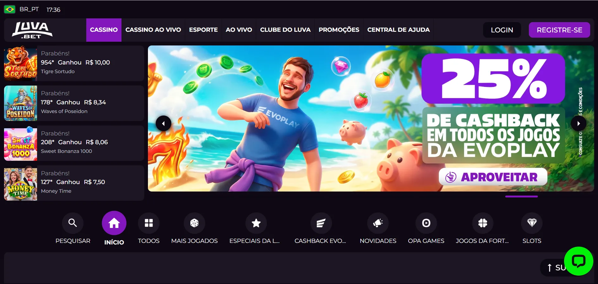 Segundo as informações disponíveis, a Luva Bet oferece Slots, Live Casino, Sportsbook e categorias rápidas como Crash Games e Mines. Nossa equipe identificou a menção a provedores como Pragmatic Play, PG Soft, Evoplay, Spribe, NetEnt, SmartSoft e Galaxsys. A grade pode variar por região e disponibilidade.
